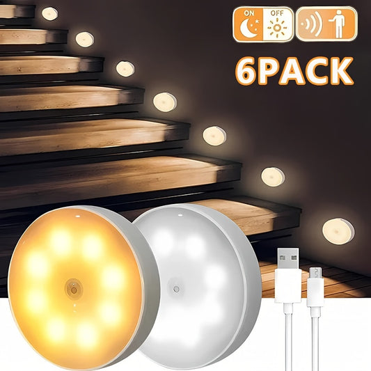 6 Lámparas LED Recargables USB con Sensor de Movimiento, Magnéticas y de Doble Luz (Blanco Frío/Cálido) para Escaleras, Closets, Dormitorios y Más